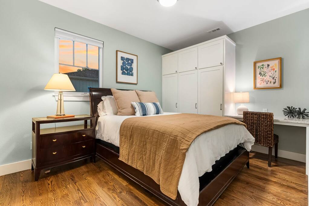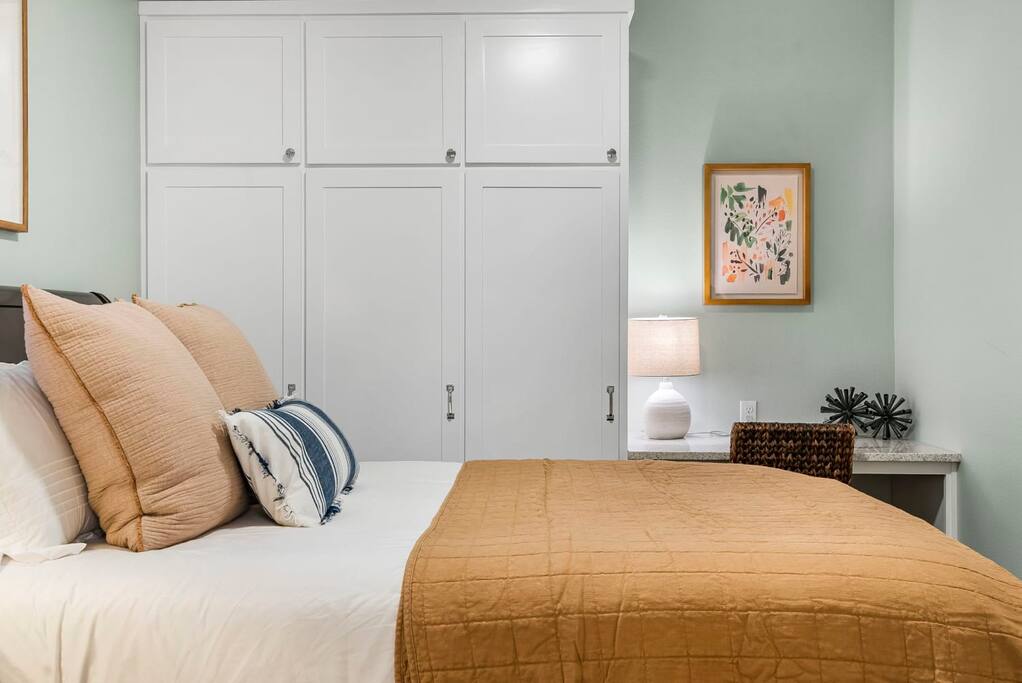 The bedroom is situated off the main living area and features a queen size bed, a study area and ample storage space for clothes.