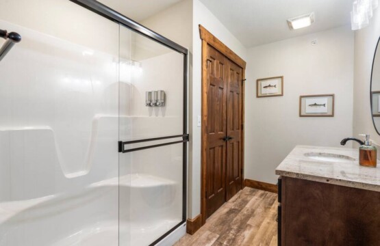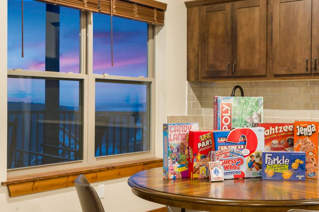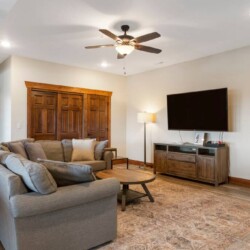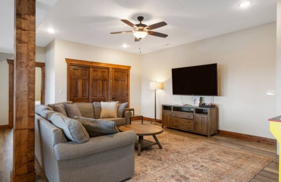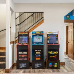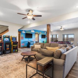 A games room with the wow factor. Based in the basement, the open plan area features Golden Tee and other arcade games, a pool table, Pop-A-Shot, foosball, board games and an Xbox with a 65” TV. The large L shaped sofa is perfect for lounging moments and a door leads out to the patio with seating for four, for a place to take in these stunning lake views.