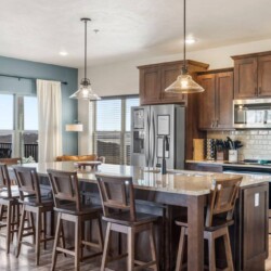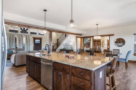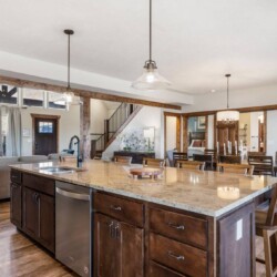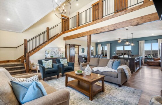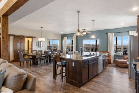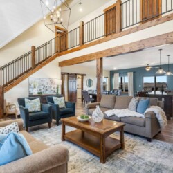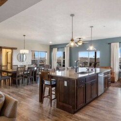 Walk into the massive open plan living area and you’re instantly greeted by the sitting area zone where there’s enough seating for 10 based around the electric gas fireplace. The vaulted ceilings create space and the large floor to ceiling windows offer endless views of Lake Table Rock beyond.