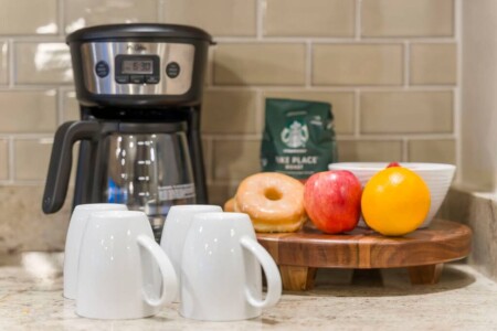 The open plan kitchen is a dream come true for fledgling chefs. It’s big enough to hold enough cooking utensils and crockery to cater for 22 guests and is fully equipped with quality appliances including two refrigerators, a dishwasher, microwave, and wet bar.
