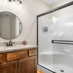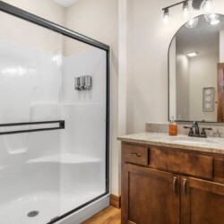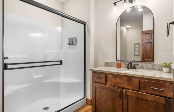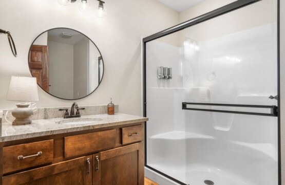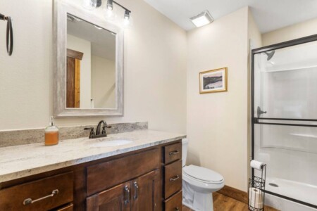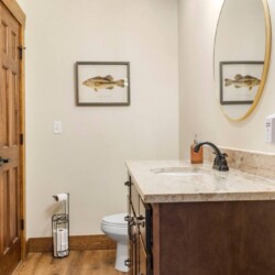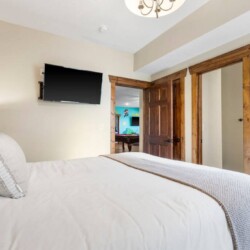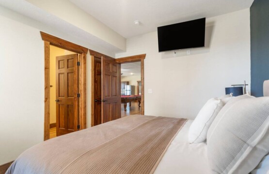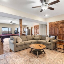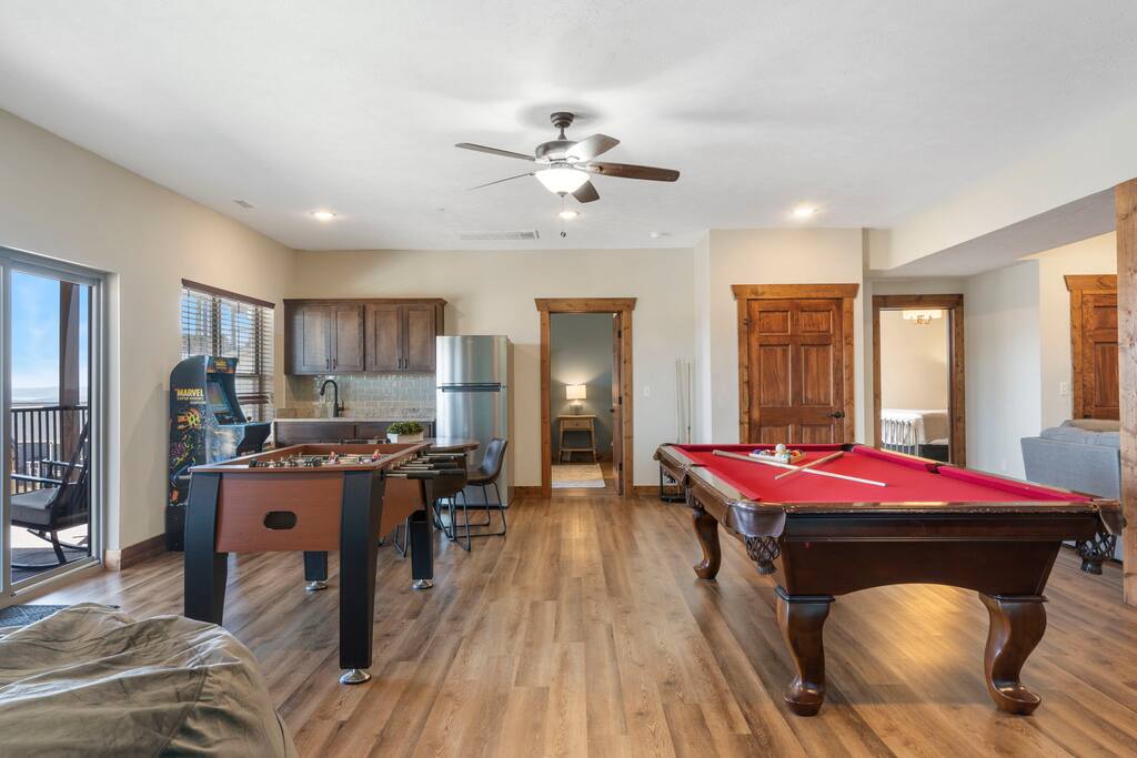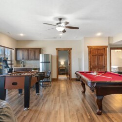 In the basement, the open plan area features Golden Tee and other arcade games, a pool table, Pop-A-Shot, foosball, board games and an Xbox with a 65” TV. The large L shaped sofa is perfect for lounging moments and a door leads out to the patio with seating for four, for a place to take in these stunning lake views.