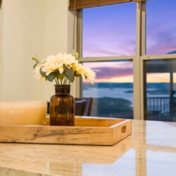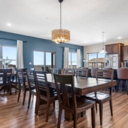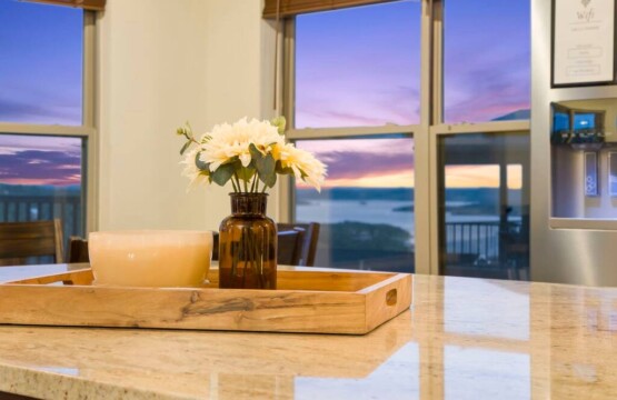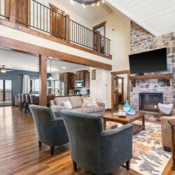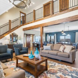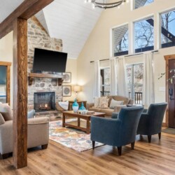 Walk into the massive open plan living area and you’re instantly greeted by the sitting area zone where there’s enough seating for 10 based around the gas fireplace. The vaulted ceilings and open staircase to the upper level create space and the large floor to ceiling windows offer endless views of Table Rock Lake beyond.