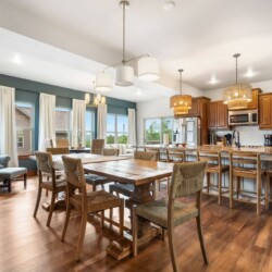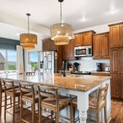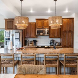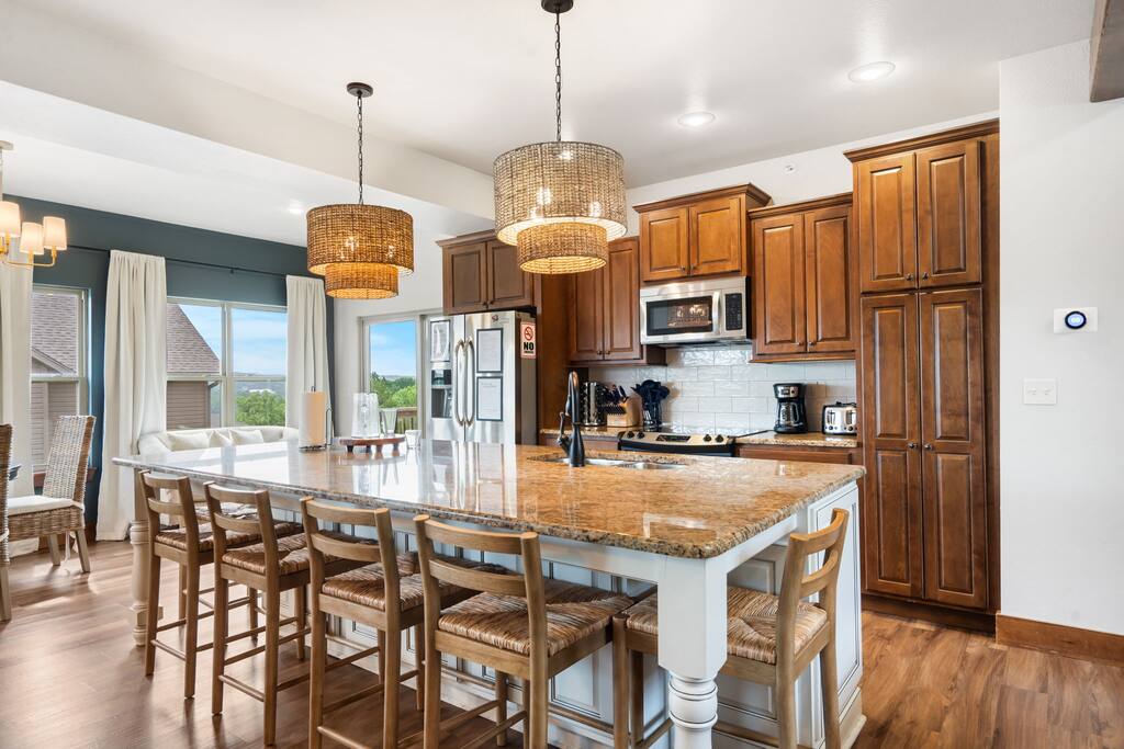 The professionally designed kitchen with granite countertops and stainless steel appliances is perfect for preparing family meals. A large island/breakfast bar has bar stool seating for four.