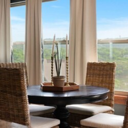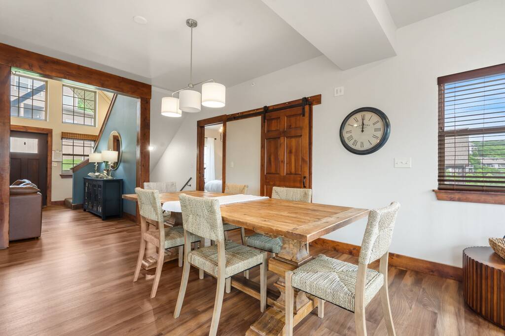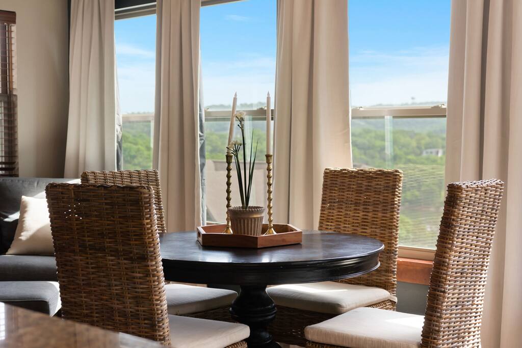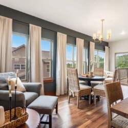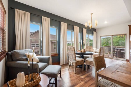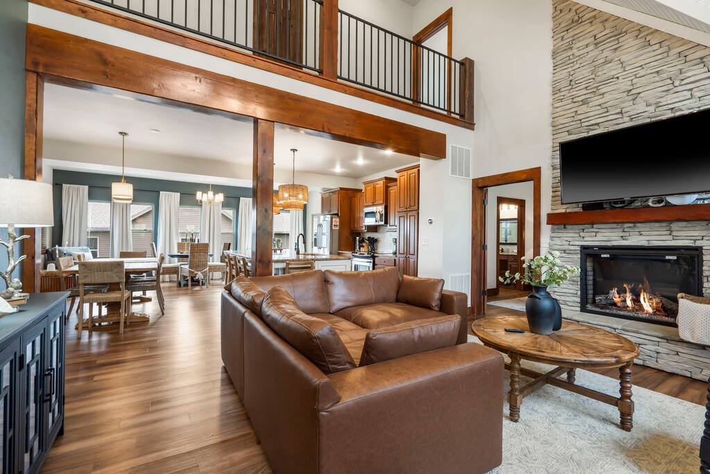 The brick gas fireplace and large flat screen TV create an attractive focal point, and there’s enough seating for six people.