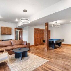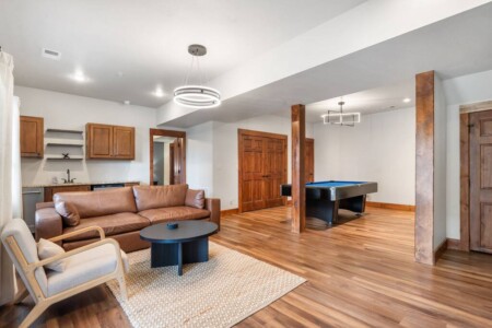 The open plan basement is home to the games room and pool table, two sofas, a wet bar and a guest toilet – everything you need for a night of at-home entertainment.