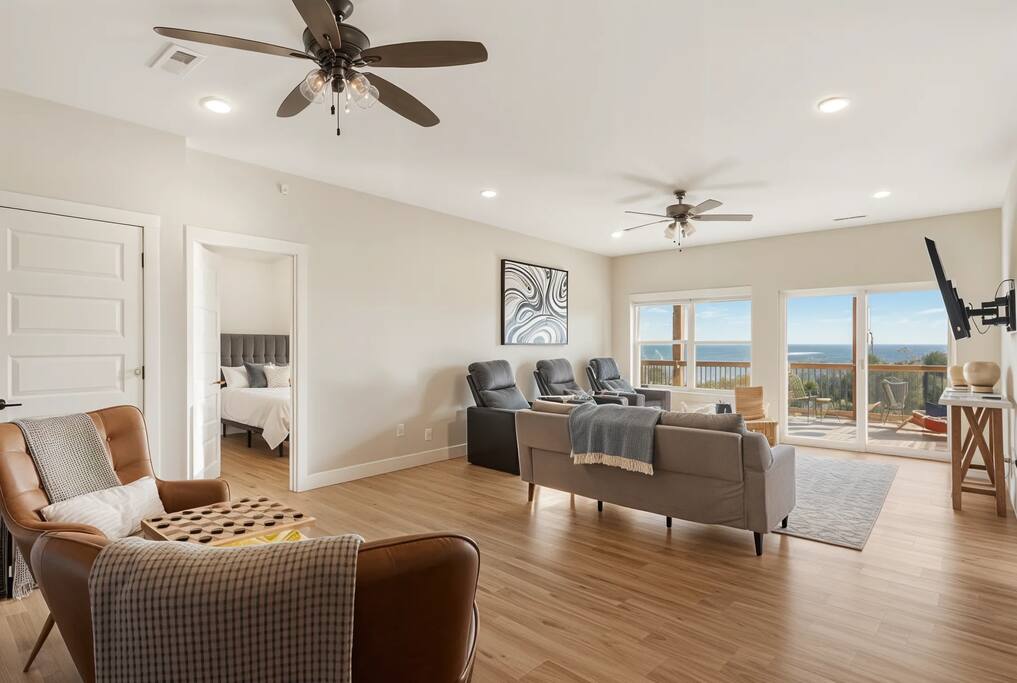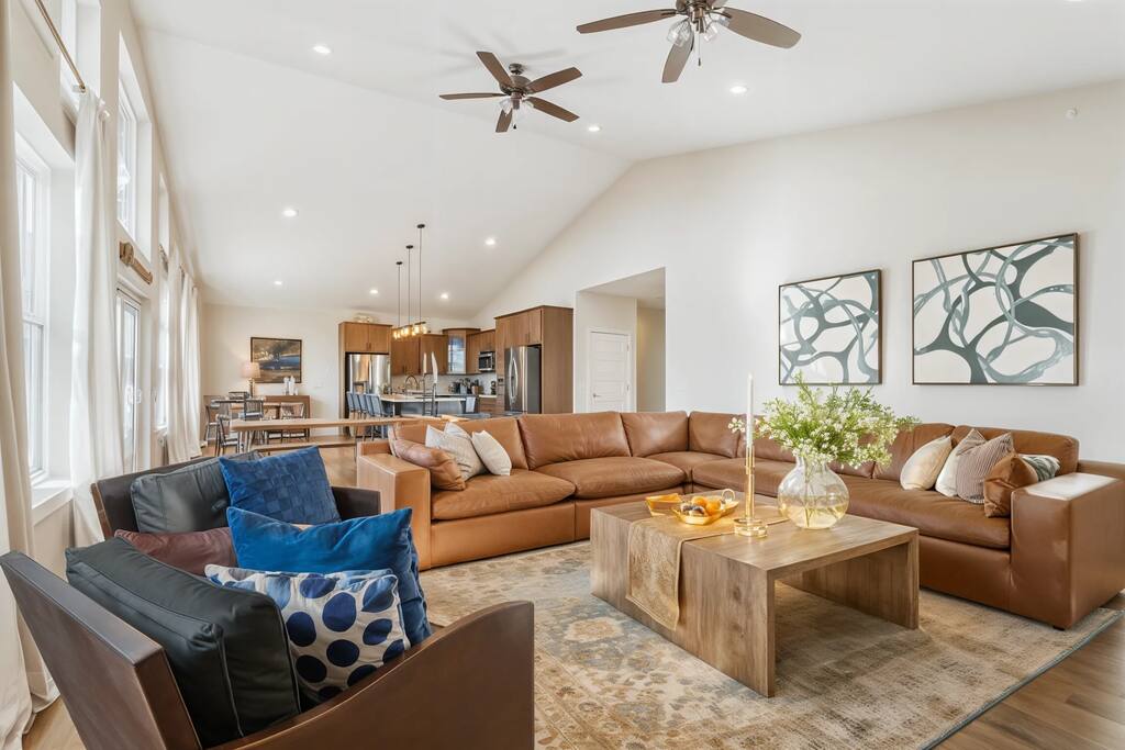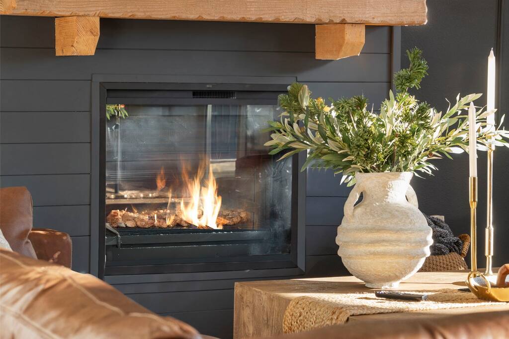 The massive open-plan living area is located on the first floor (ground level) and features a sitting area with sofas and armchairs positioned in front of the gas fireplace with a 55” Smart TV above.