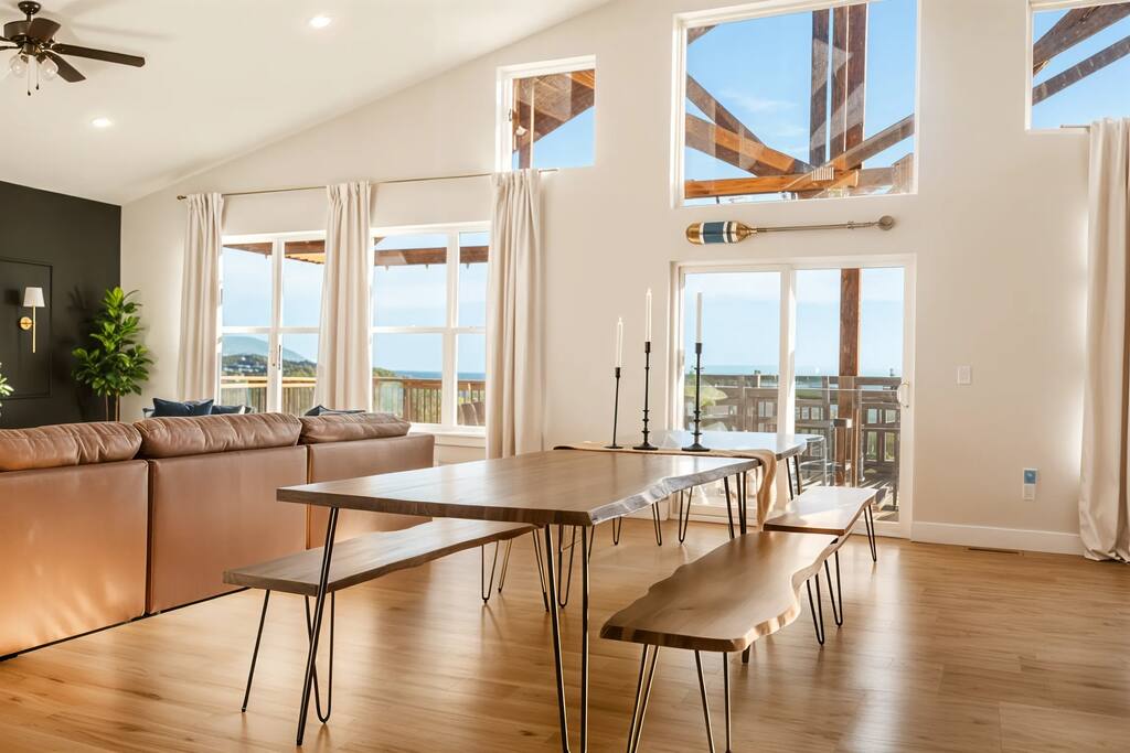 The dining area separates the sitting and kitchen space and features a bench-style dining table to seat up to 16 guests.